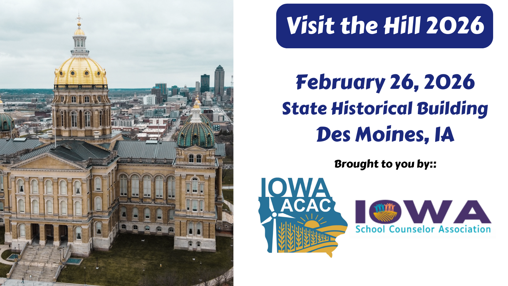 Join Iowa ACAC and the Iowa School Counselors Association for our FREE event to learn more about what's happening in the State Capitol and how it affects our education system. Sessions will include discussion on Bill Tracking Tools, Advocacy, FAFSA updates and more - then after lunch, we'll head up to the Capitol to speak with legislators.